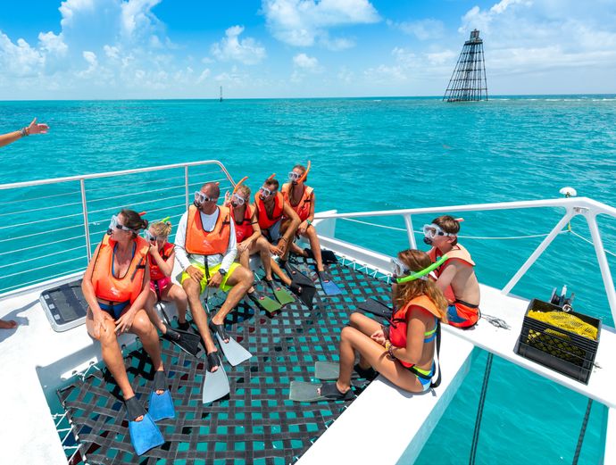 The adventure starts when you board the sleek 58-foot power catamaran. Relax on deck and enjoy the thrill of speed over water as your expert captain runs offshore to the best snorkeling site for the day’s weather and water conditions. Take in the offshore view of Key West and 360 scenic degrees of wide-open marine wonderland. Keep an eye out for wildlife as it is not uncommon to spot sea birds, dolphins, turtles, and schools of game fish. Your friendly crew members stand by to point out wildlife and other interesting sights, keep you refreshed with water and sodas, and answer any questions you might have about snorkeling.